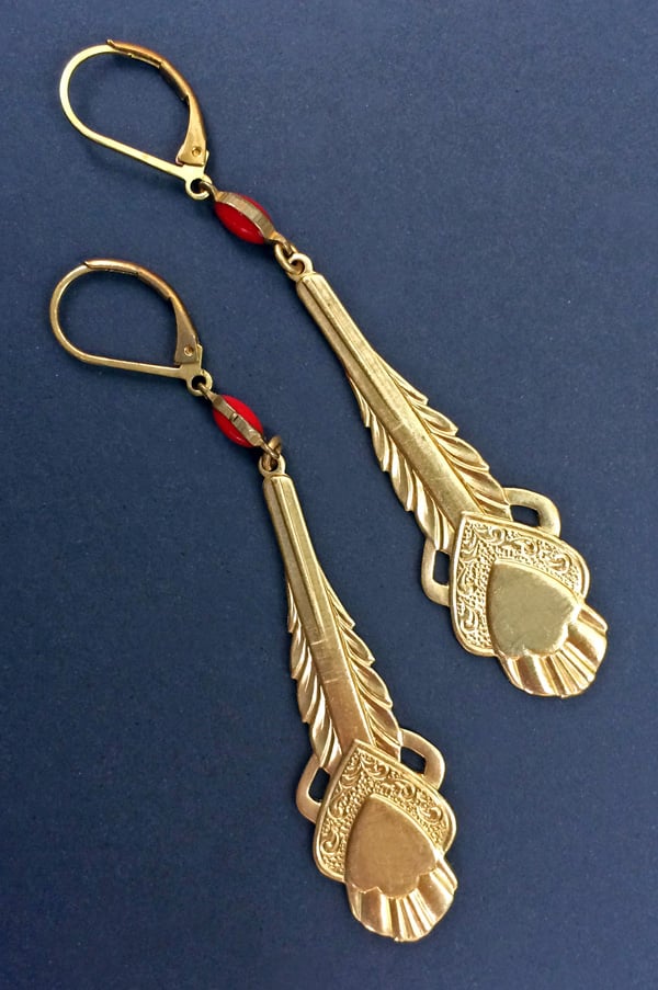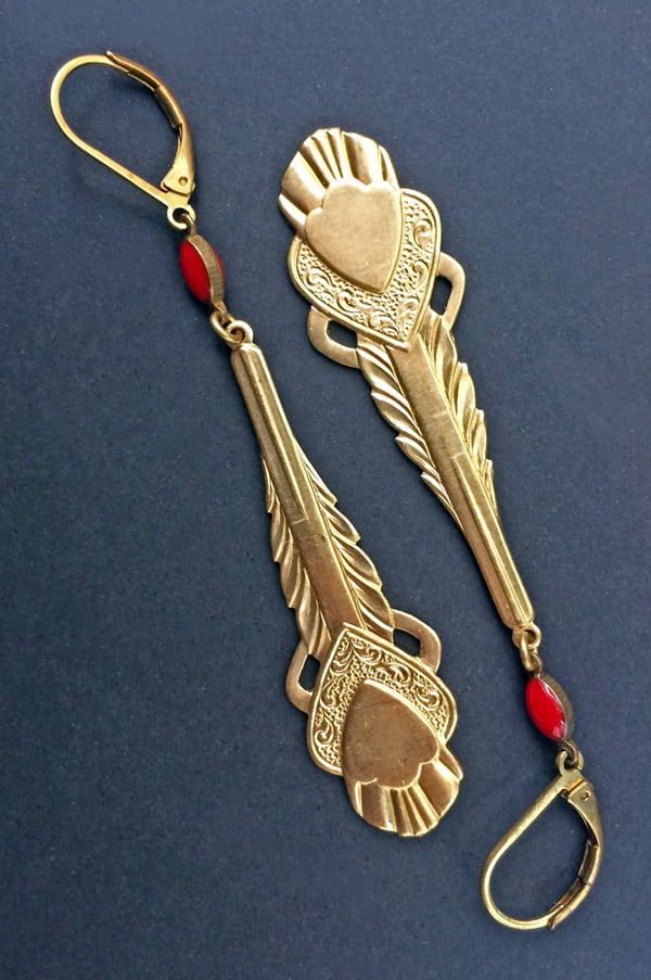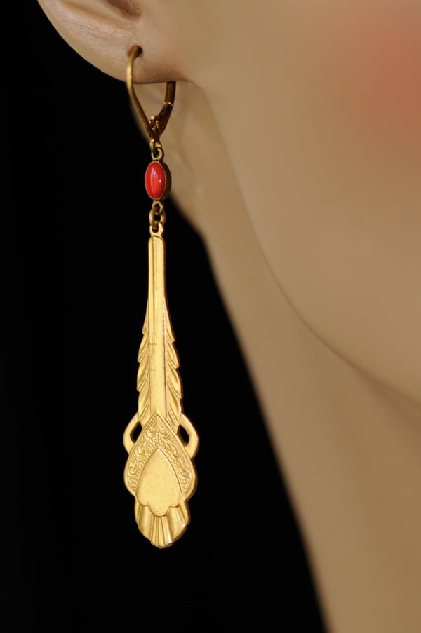 Boucles d'oreille composées d'estampes en laiton et gouttes en email rouges. Inspiration Art déco pour ces dormeuses BERTHILLE à arborer le jour comme en soirée. Légères et chic. Longueur : 7,7 cm.