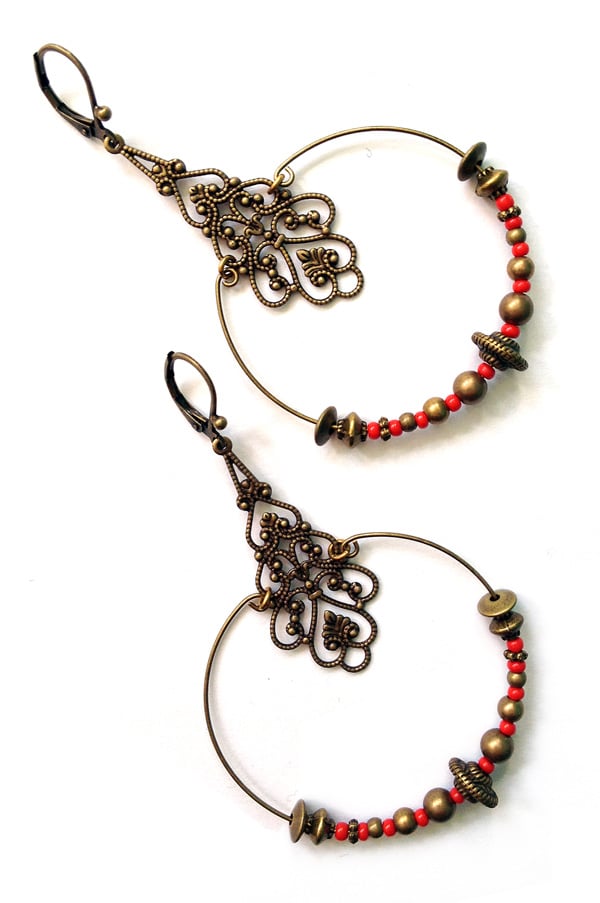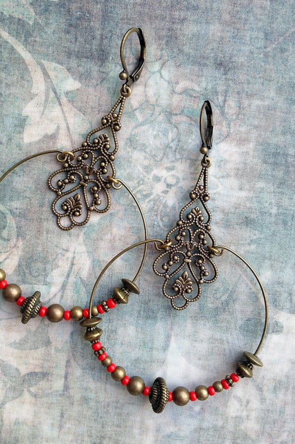 Gypsy earrings made of antique brass and red stone beads. Urban nomads: no doubt you will fall in love with these pioneering BOHO earrings! Length: 8,5 cm. Limited edition.