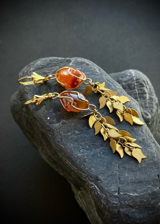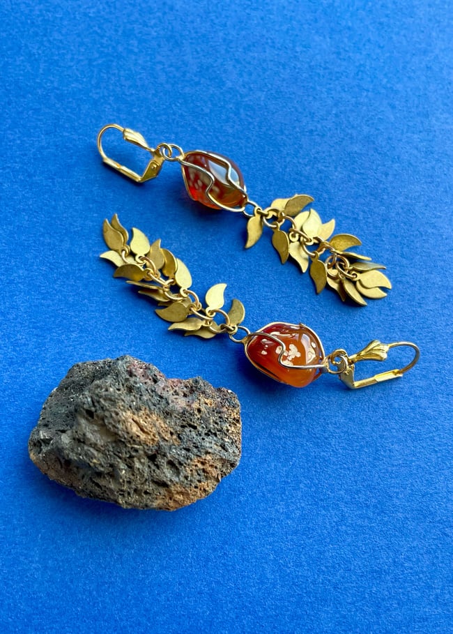 Boucles au chic raffiné. Cornaline, laiton doré (dormeuses) et laiton brut (cascade de feuilles). Longueur : 7,5 cm. Assez légères. Série limitée.