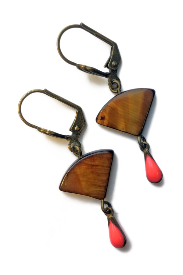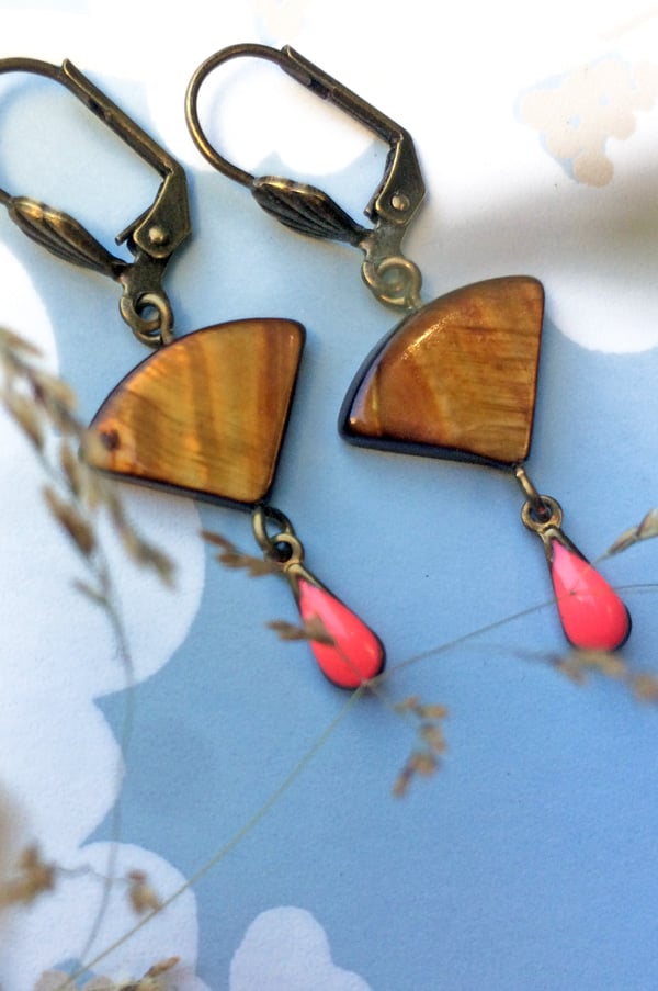 Aged brass earrings with nacre and pink enameled droplets. Casual, girly, charming... Choose ELSA earrings for a subtle vintage touch. Length: 4.3 cm. Lightweight. Limited edition.