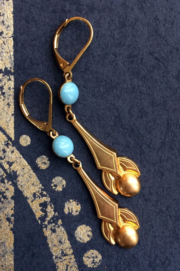 Pendants d'oreille d'inspiration Art déco. Estampes en en laiton, perles intercalaires émaillées bleu gris. Le raffinement casual des dormeuses GABY en fait un must have pour la parisienne qui sommeille en vous... Ultra légères et chic. Longueur : 5,5 cm. Série limitée.