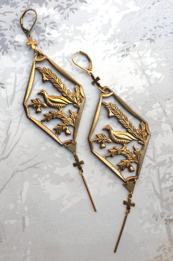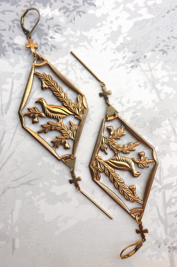 Longues boucles d'oreille / dormeuses Art déco en laiton brut. Deux splendides estampes ajourées en forme de losange encagent deux oiseaux flanqués de végétaux à la manière médiévale. Géométrie et ornementation dialoguent mystérieusement. Vous aimez les dormeuses GUENIEVRE ? Découvrez aussi le pendentif ! Longueur : 13,5 cm. Série limitée.