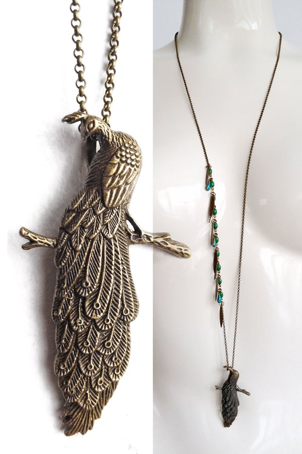 Aged brass peacock pendant, Belcher chain, boho sequence of feathers and enameled parts. LEON pendant / long necklace is a casual yet refined must have. Let's fall in love with its asymmetric composition as well as its extravagant blue and green plumage… and have a look to LEON earrings too! Length: 106 cm. Limited edition.