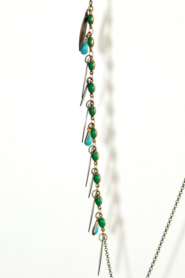 Pendentif paon en laiton antique, chaîne à mailles circulaires (chaîne Belcher), suite bohème de plumes, gouttes émaillées turquoise et pièces intercalaires émaillées vert. Un bijou délicat, à la fois casual, folk et vintage : mi-sautoir, mi-pendentif, LEON joue sur l'asymétrie et l'harmonie bleu-vert des plumes du paon. Vous aimez les parures ? Jetez un œil aux boucles d'oreille LEON… et faites la roue ! Longueur : 106 cm. Série limitée.