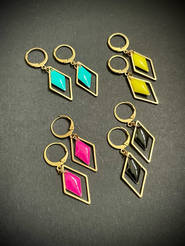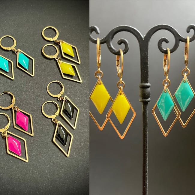 Dormeuses casual à la modernité art déco. Duo de losanges (en laiton & laiton émaillé). Couleurs pop au choix. Ultra légères. Longueur : 4 cm. Série limitée.