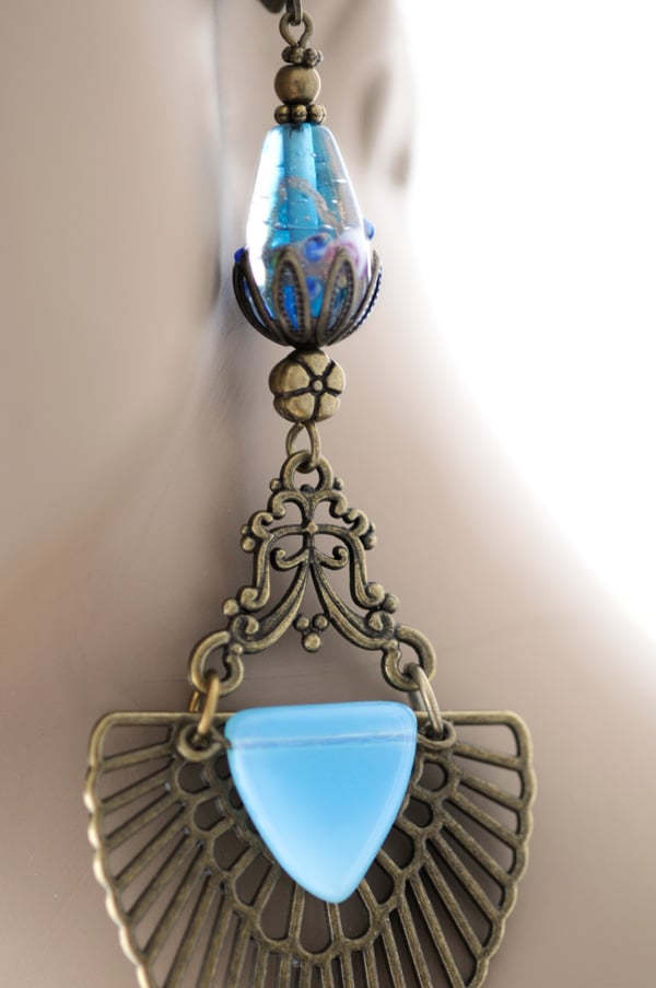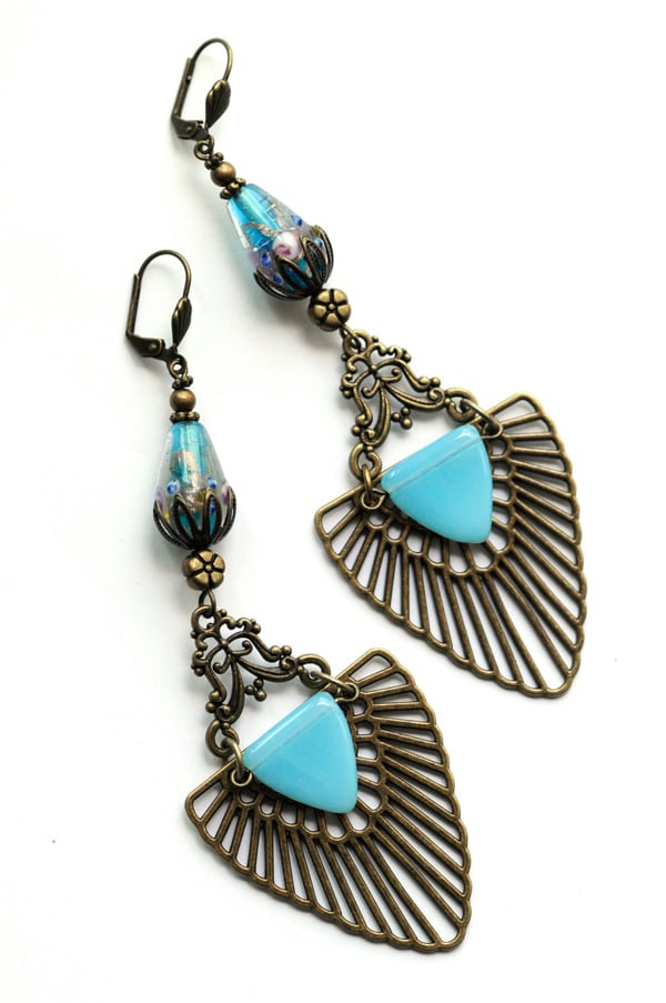 Antique brass earrings with with handmade blue glass beads. For the best, match PEACOCK radiant earrings with a simple outfit for a boho chic style. Length: 11.5 cm. Limited edition.