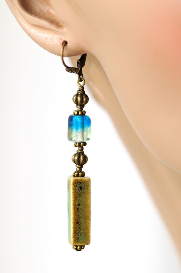 Casual earrings featuring a gorgeous composition of glass beads, ceramic beads and antique brass baroque elements. Ethnic style lovers, will you resist SANTA FE dangle earrings? Length: 7.5 cm. Limited edition.