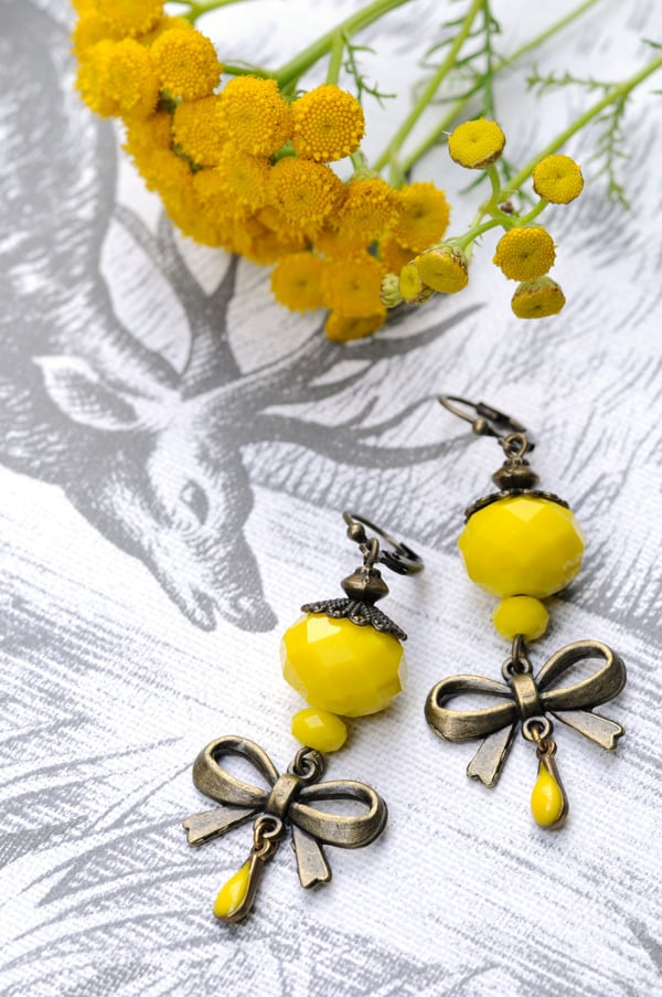 Pendants d'oreille / dormeuses en laiton antique, cristal de verre facetté jaune citron et gouttes émaillées jaune. Clin d'œil à nos aïeules, les boucles d'oreille SORRENTE mettent en scène de charmants nœuds en laiton antique, d'esprit vintage. Un romantisme affirmé… Longueur : 6 cm. Série limitée.