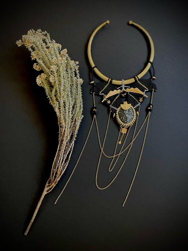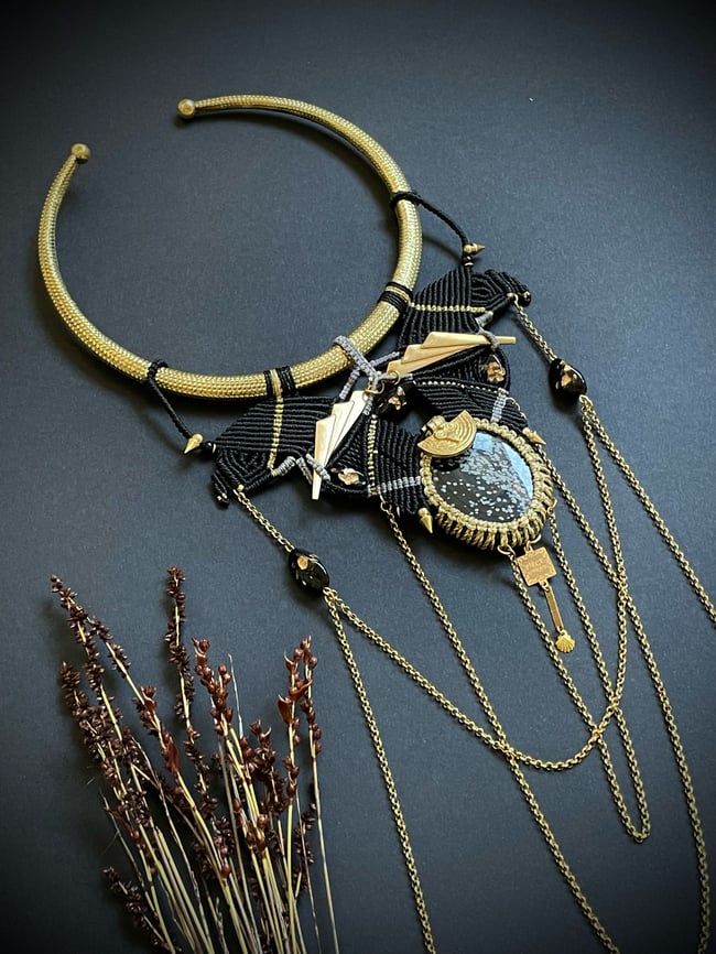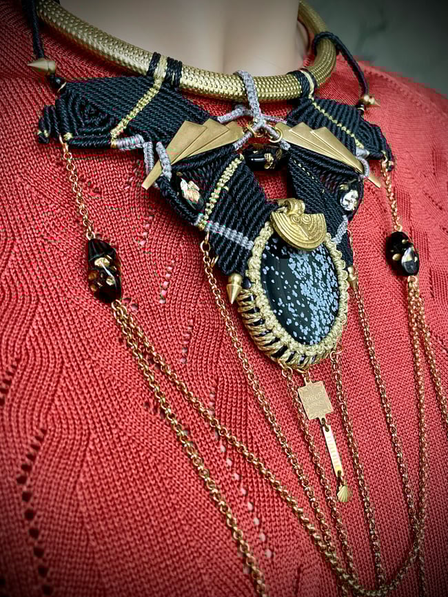 Plastron spectaculaire en micromacramé et splendide obsidienne "flocon de neige", torque, estampes et charms en laiton, chaînes en acier inoxydable. Le fil utilisé pour le tissage est de la meilleure qualité : il s’agit du fil brésilien Linhasita en polyester enduit de cire. Modèle unique.